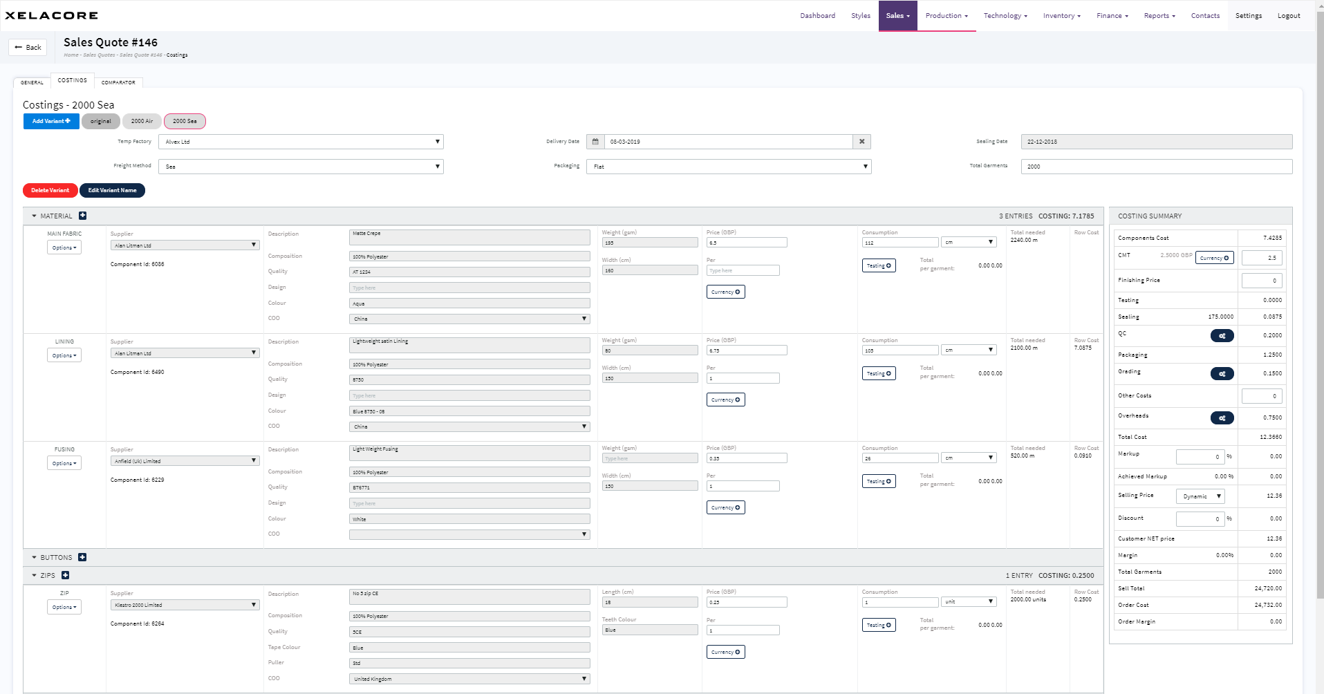 Each costing variant can be uniquely amended without affecting the original costing. Changes can be made to model different freight methods, source components from different suppliers, adjust consumption, add or remove items, to achieve the selling price to the customer and profit margins achievable.