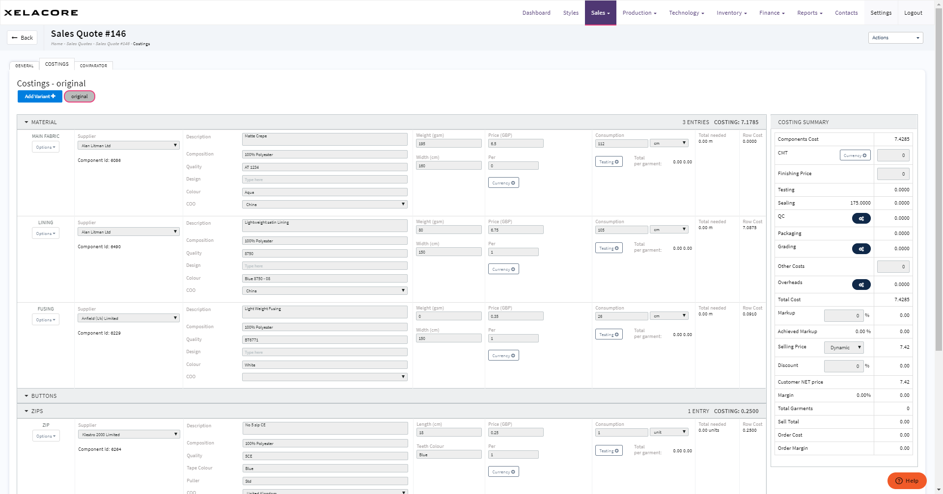 Xelacore imports the original costing sheet from the style module and "Locks" the component entries to prevent editing. This ensures that you can always see the original cost and compare it against any subsequent cost variant that you create.